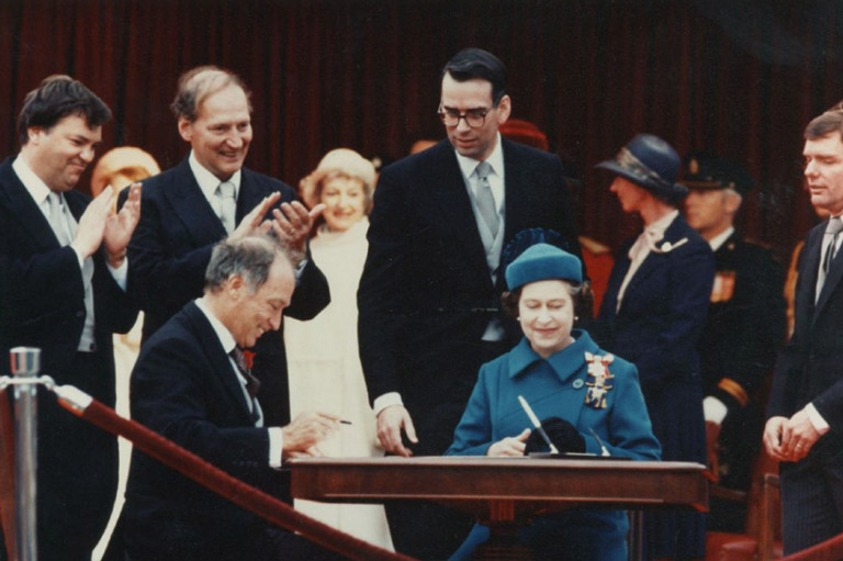 Yet such stylistic changes belie the fidelity maintained by Canada’s liberal establishment towards the Crown. Trudeau Sr. and the Queen, by all accounts, actually had a warm and fruitful relationship, which is exhibited in two more iconic photos: one in which the prime minister is peeking under the monarch’s umbrella, and another featuring the two presiding over the “patriation” of the constitution, in which Canada severed the last colonial links with London and became a fully sovereign state. For the final act in this constitutional saga, in 1982, the Queen came to Ottawa to personally grant royal assent to what had been the elder Trudeau’s life’s work: the pillars of today’s progressive Canada — the Charter of Rights and Freedoms, official bilingualism, multiculturalism — were codified.