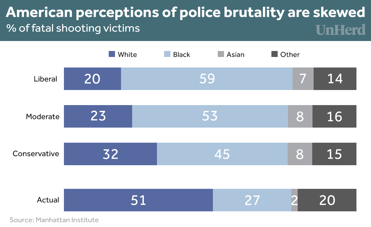Findings from my Manhattan Institute report, published today, suggest that it has. Indeed, they reveal that many people hold warped beliefs about both the prevalence and racial distribution of police violence. For instance, the average respondent estimated that over half (54%) of fatal police shooting victims since 2015 were black and that just 23% were white.