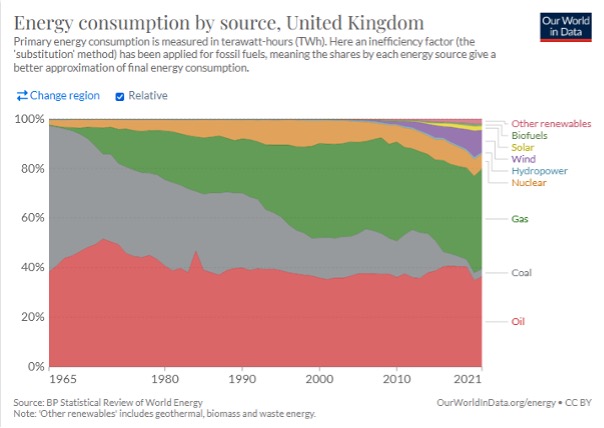 Some of this gas comes from Britain’s North Sea gas fields. But not all of it. In 2019, almost half of this gas was imported. Add to this the fact that around 35% of the oil we use is imported and it starts to show how dependent the country is on energy imports.