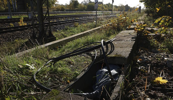 Newly-laid cable lies next to railway tracks at the spot where technicians repaired a section of fibre optic cable in Berlin. Credit: Getty