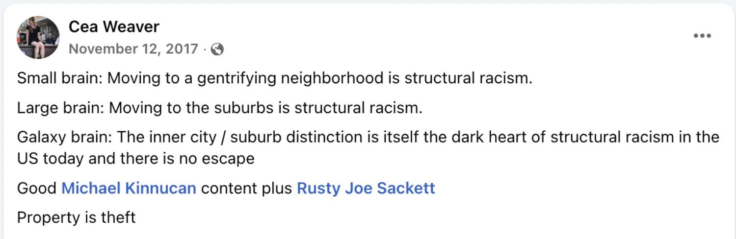In a 2017 post, for example, she argued that “moving to a gentrifying neighborhood” is tantamount to “structural racism,” as is “moving to the suburbs,” before adding: “Property is theft.”
