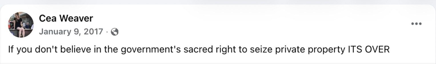 Weaver has also defended what she describes on Facebook as “the government’s sacred right to seize property” in a striking echo of her X posts in which she also appears to call for the abolition of not just abusive landlordism, but private property as such.