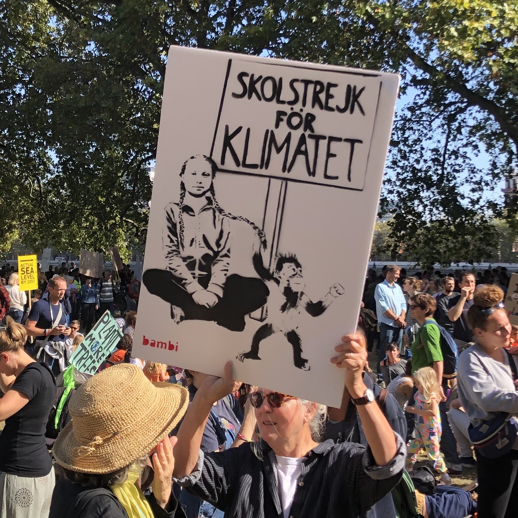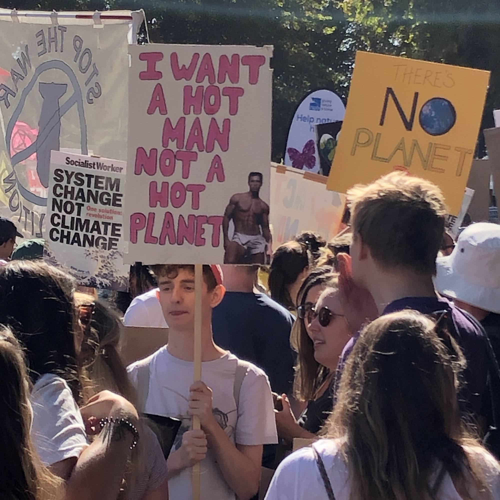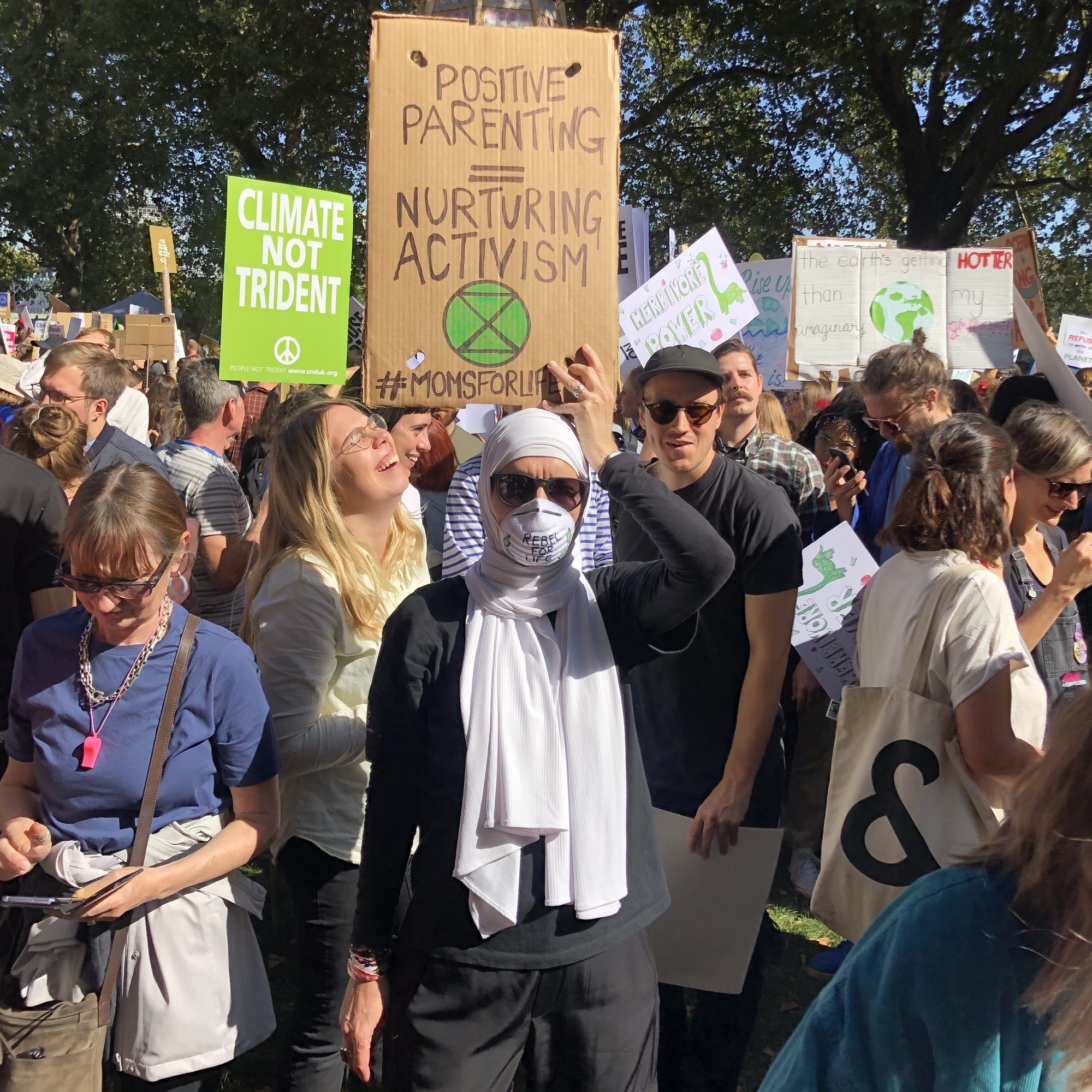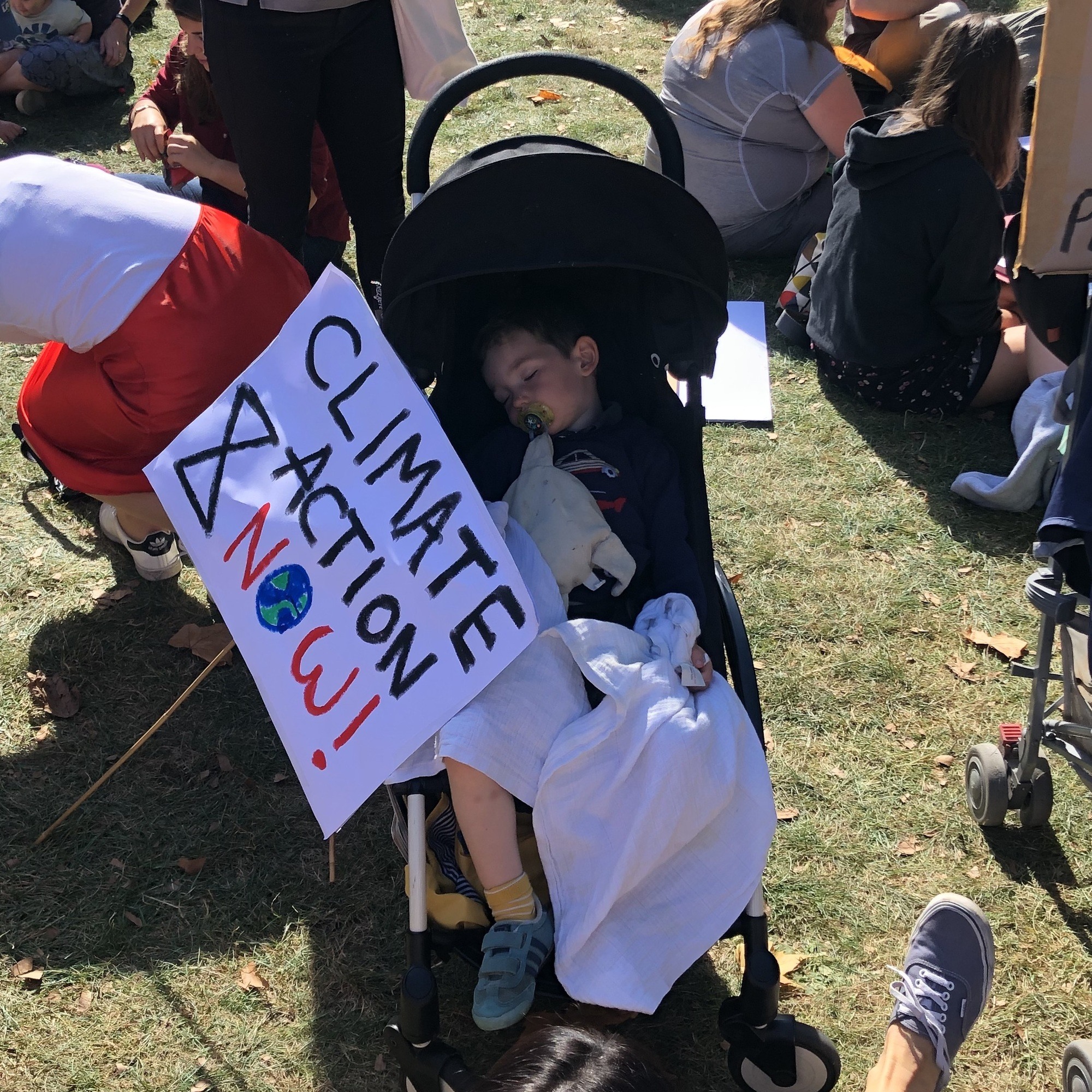 Some families having a nice day out in the sun, lots of sleeping children and babies with headphones on, and a whole cluster of different issues being thrown in along with climate change: anti-capitalist, anti-fascist, pro LGBT, pro marijuana…. Here were some of our favourite signs (the “positive parenting, nurturing activism” protester looked a wee bit scary, not sure I’d like to be positively parented by her…)
