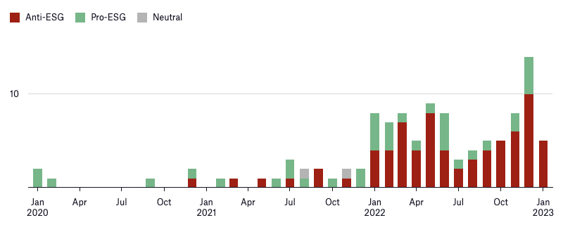 Now Republicans are waging their anti-ESG offensive at a legislative level — and with some success. As of January 2023, nearly half of all US states either have some kind of anti-ESG restriction or have blacklisted ESG actions, according to an Energy Monitor analysis. In fact, anti-ESG “developments” have rapidly outpaced pro-ESG measures over the past three years, illustrating how this once relatively anonymous campaign is going mainstream.