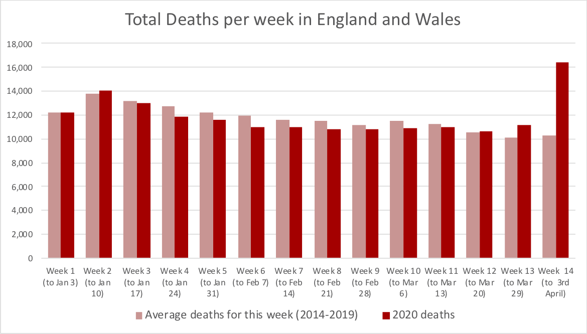 New data out this morning from the Office of National Statistics shows that in the week ending 3rd April, the total number of deaths in England and Wales shot up dramatically above the average for the past five years. This represents a much greater increase than the previous week ending March 29th.