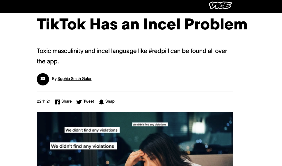This week Vice World News ran a piece entitled “TikTok Has an Incel Problem”, documenting the platform’s apparent failure to remove instances of hate speech connected with incels, a community I’ve spent the past several years studying. The author writes: